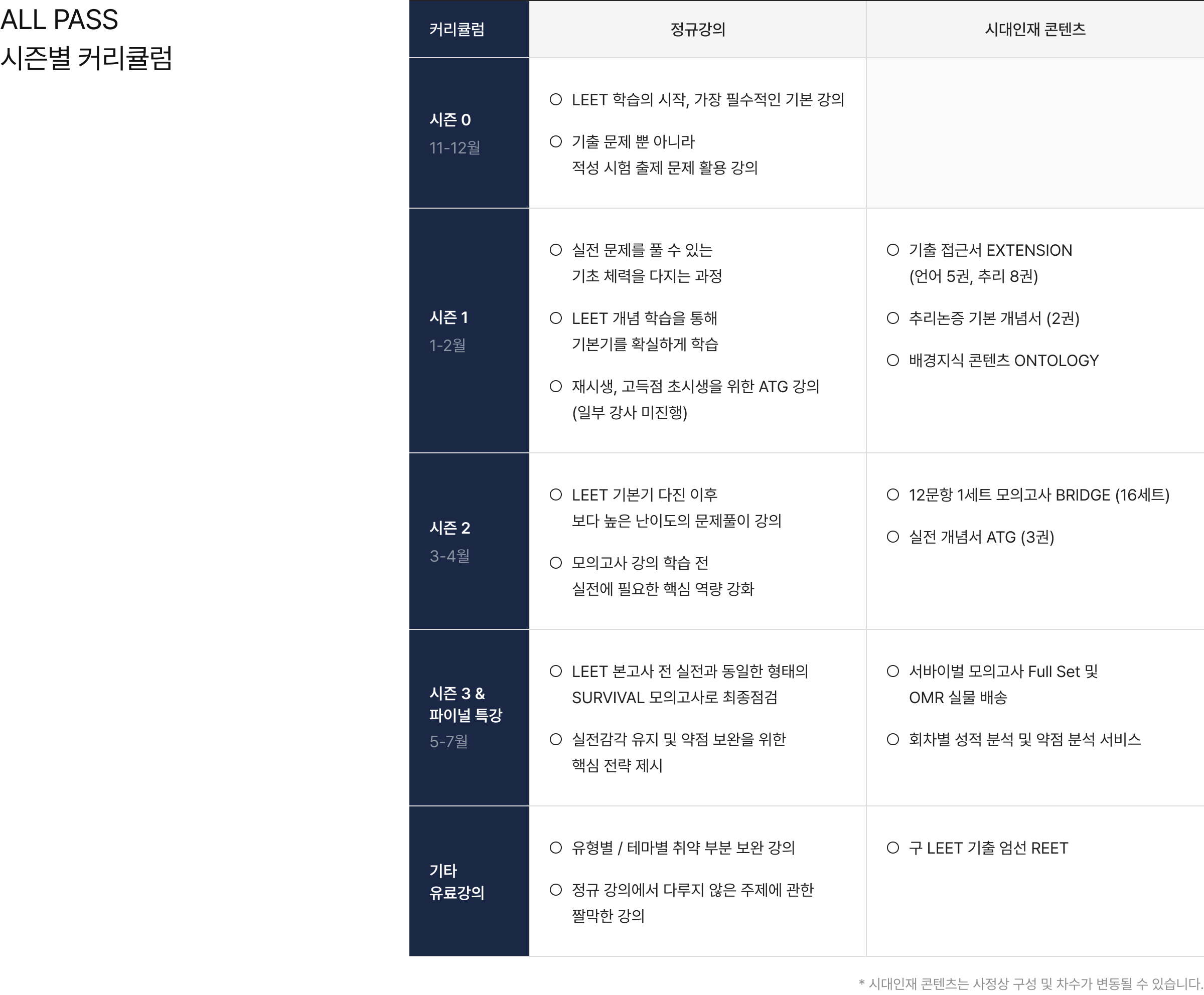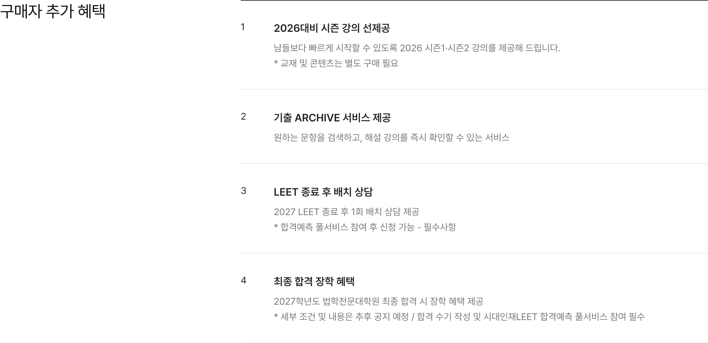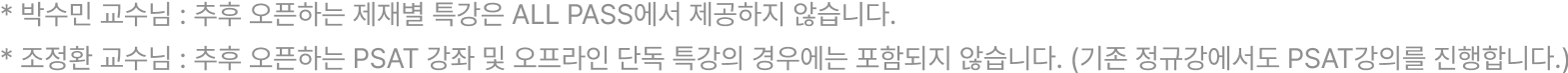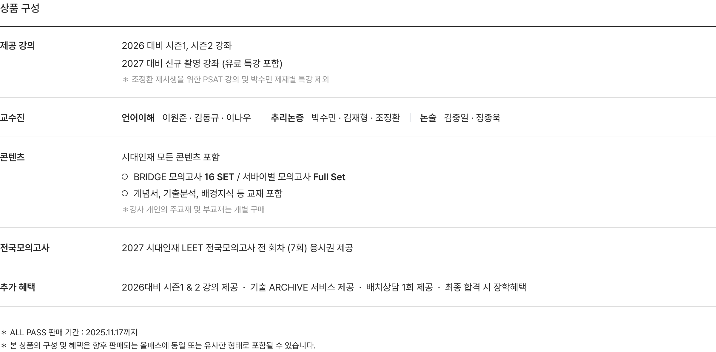 - 패스 내에서 선택한 개별 강좌의 수강기간은 상품의 수강기간과 동일하게 2027 학년도 LEET 본고사일까지 입니다.
