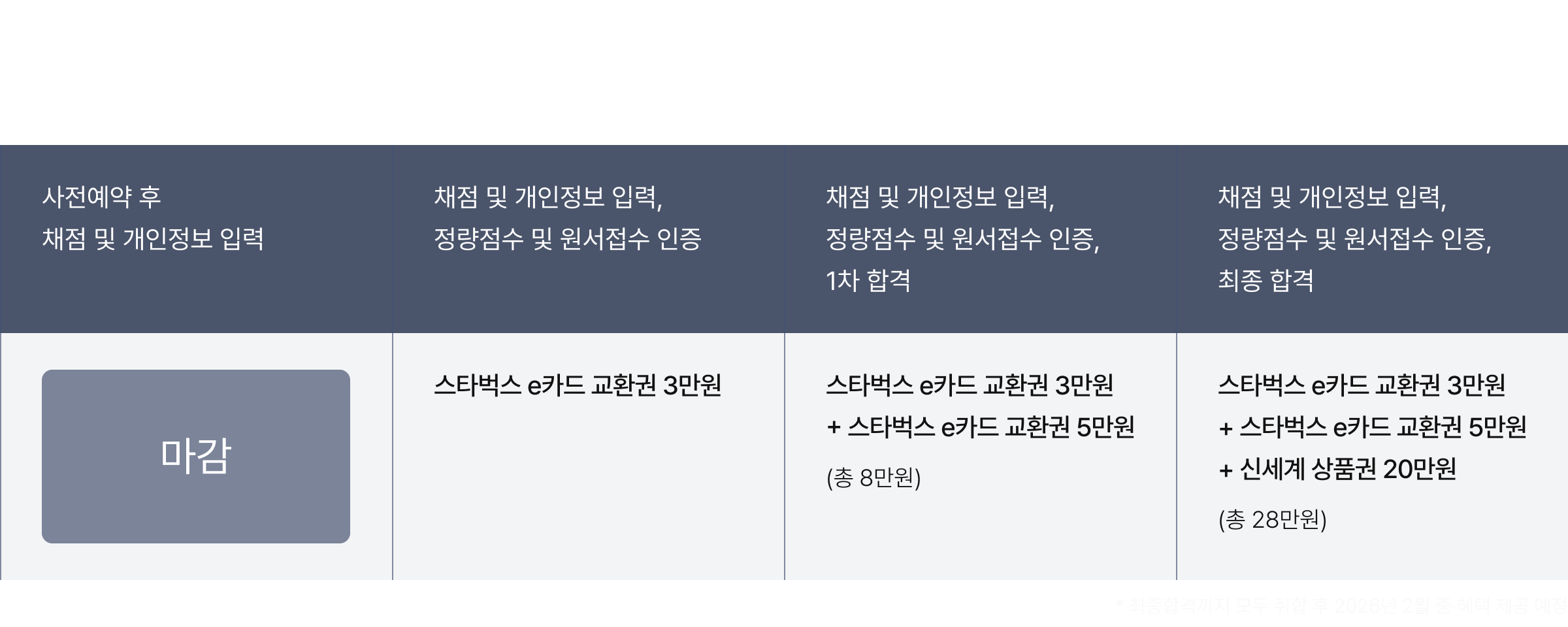 ㆍ①,②번을 순서대로 진행하고 ③,④에 모두 해당하는 경우 ⑤ 합격수기 작성 후 [스타벅스 e카드 교환권 3만원+5만원+신세계 상품권 20만원(총 28만원)]이 제공됩니다.