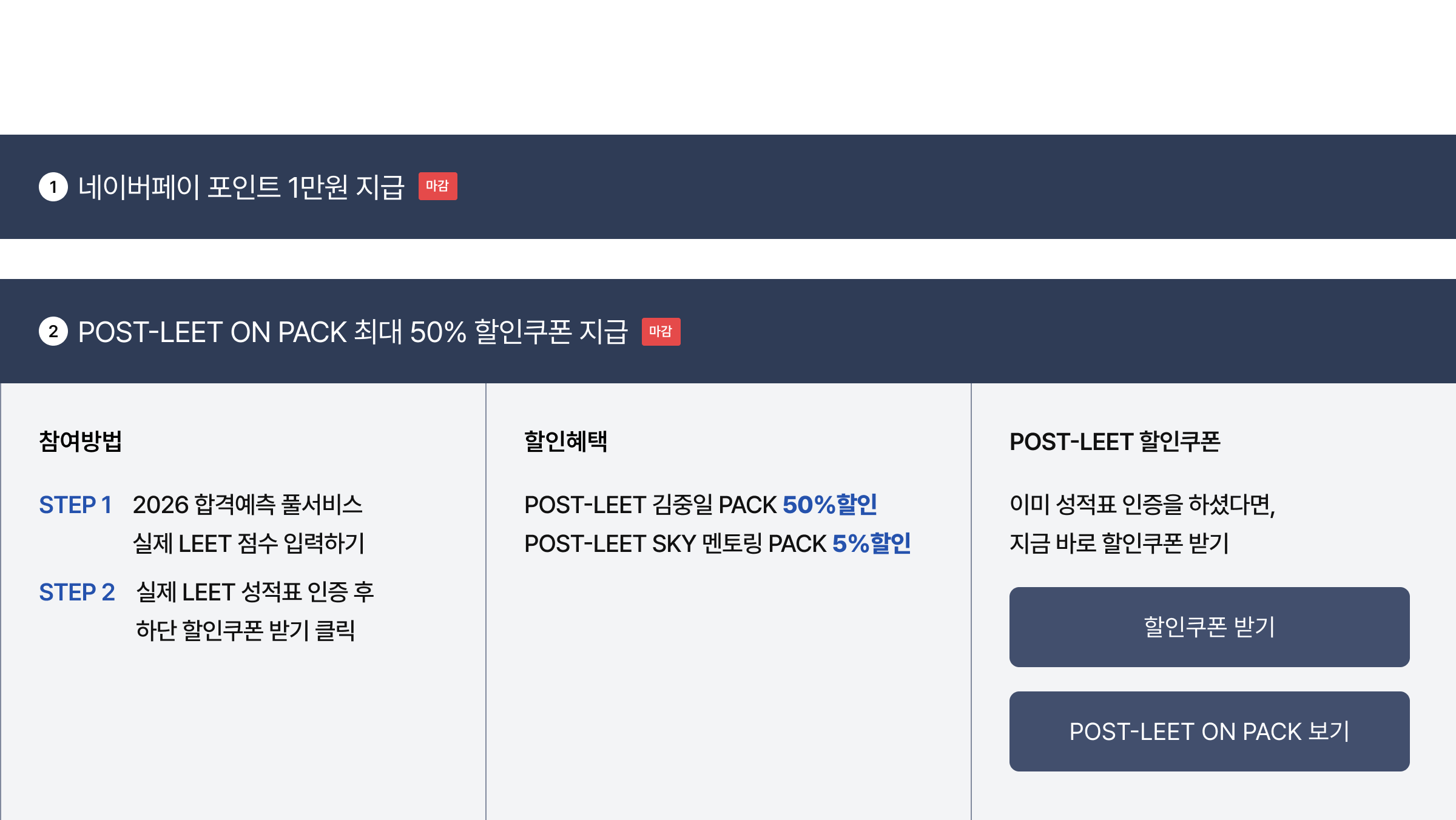 LEET 성적 입력자 한정 제공되는 혜택으로 자기소개서 특강의 경우 LEET 성적 입력 후 영업일 기준 1~2일 후 지급되며 학교별 지원 전략 특강은 9/1(월) 이후 개별 문자로 안내될 예정입니다.