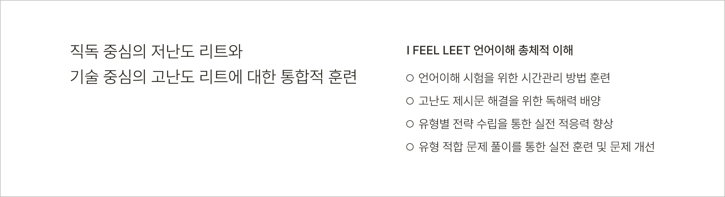 - 지속적으로 변화하는 언어이해의 특성을 고려해 시험 본질에 대한 대비 및 다양한 독해 기술 습득