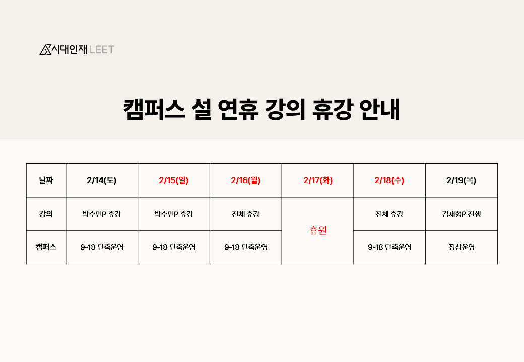 [공지] 시대인재LEET 설 연휴 학원 운영 안내 2026-01-28