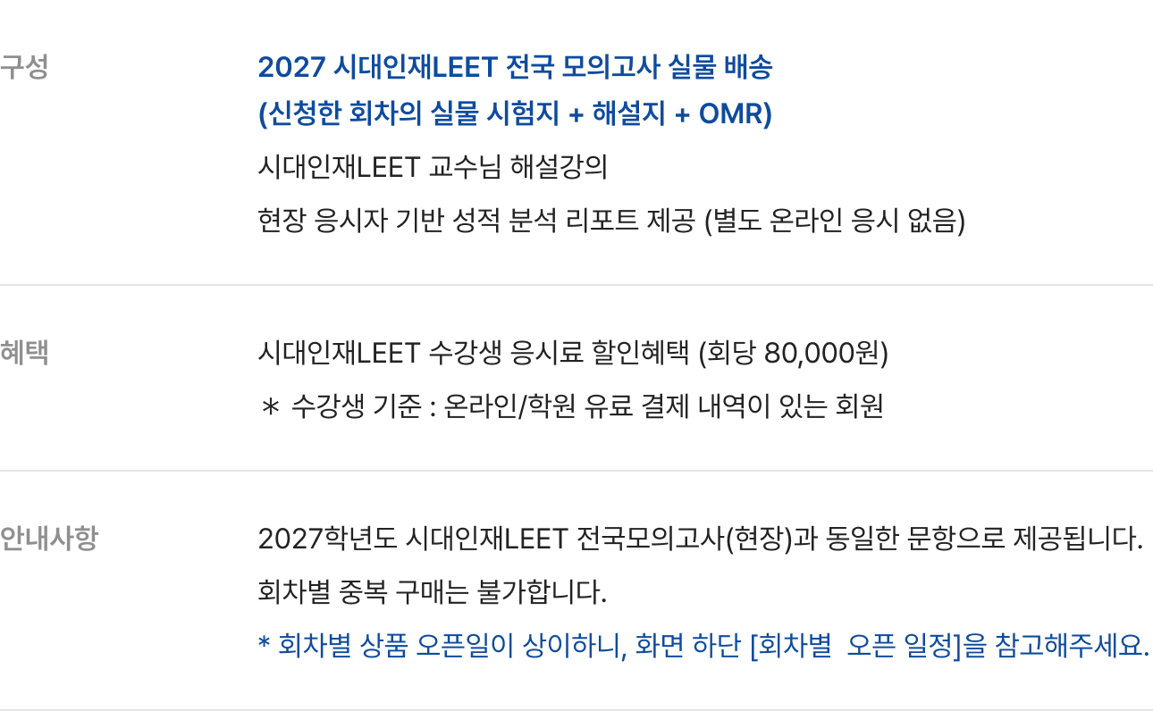 시대인재LEET는 (이하 ‘회사’는) “정보통신망 이용촉진 및 정보보호”에 관한 법률을 준수하고 있습니다.